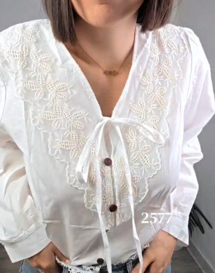 Blusa blanca femenina de estilo romántico y elegante. Confeccionada en tela ligera y fresca, ideal para primavera y verano. Presenta delicados bordados florales en relieve en la parte frontal, detalle de encaje central y escote en “V” con lazo ajustable que aporta un toque femenino y sofisticado.