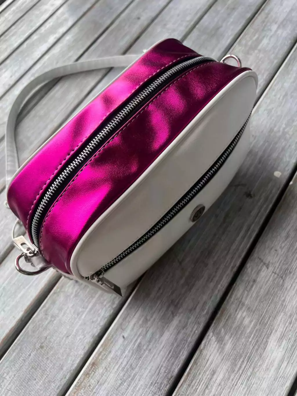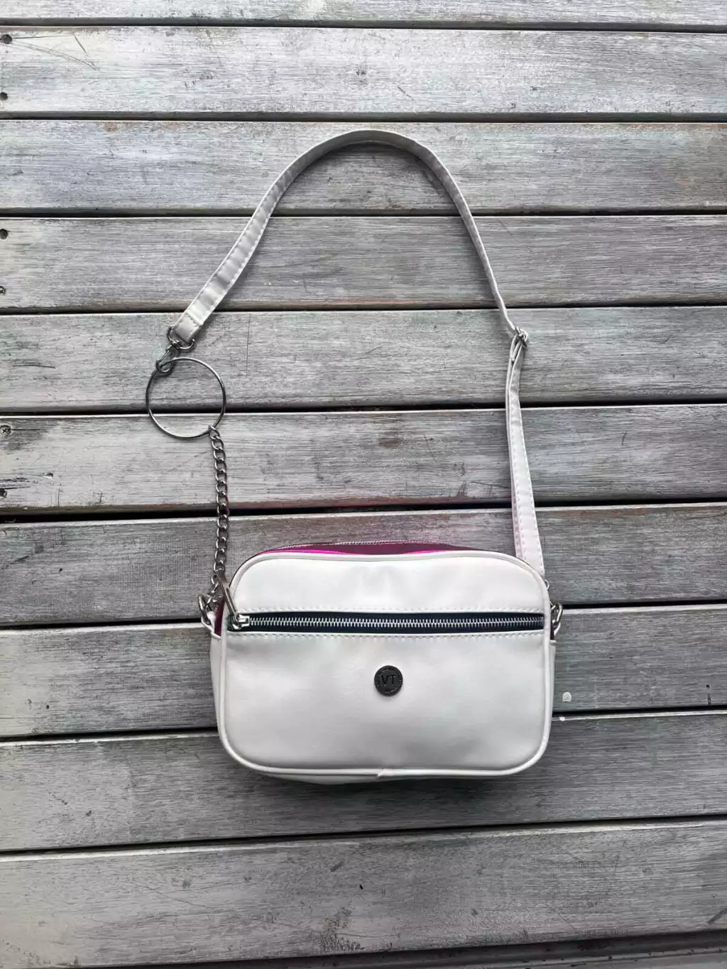 BANDOLERA MARCA VITALIA DE COLOR BLANCA Y FUCSIA